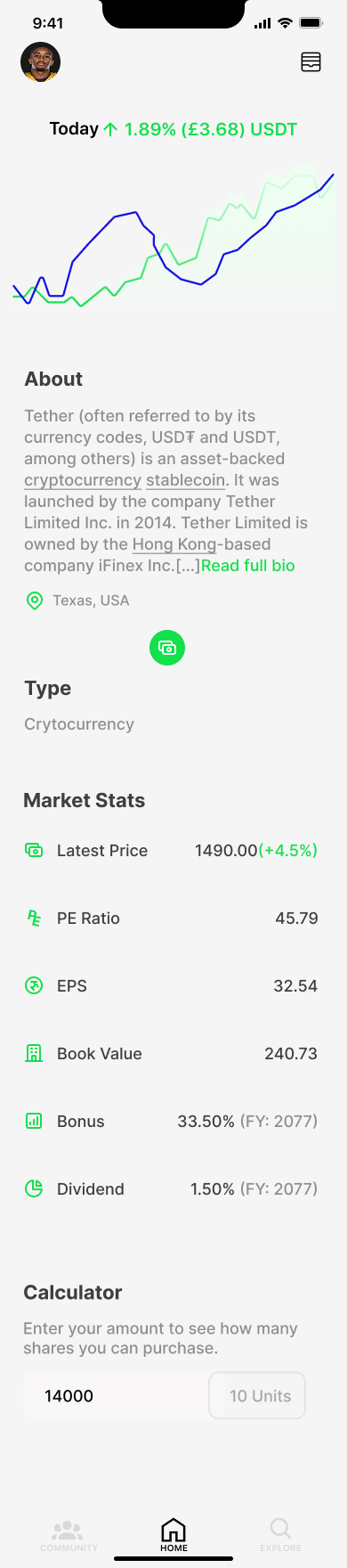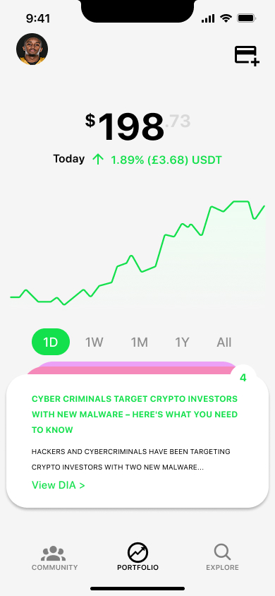 Graph de performance, historique de transactions, actions rapides (buy/sell).